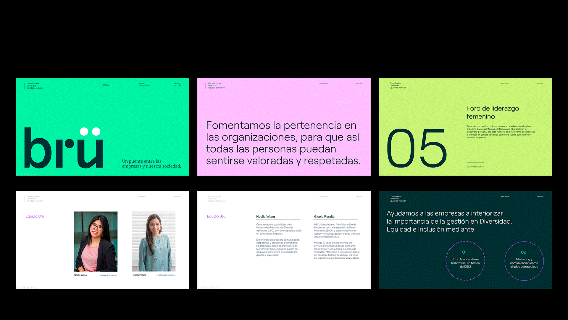 El reto para el proyecto consistió en construir un sistema de identidad visual que muestre a la marca como diversa e inclusiva, y a la vez reflexiva, prestigiosa y moderna. Propusimos una identidad que soporte los distintos temas que aborda BRÜ: diversidad, equidad e inclusión como generadores de cambio social.